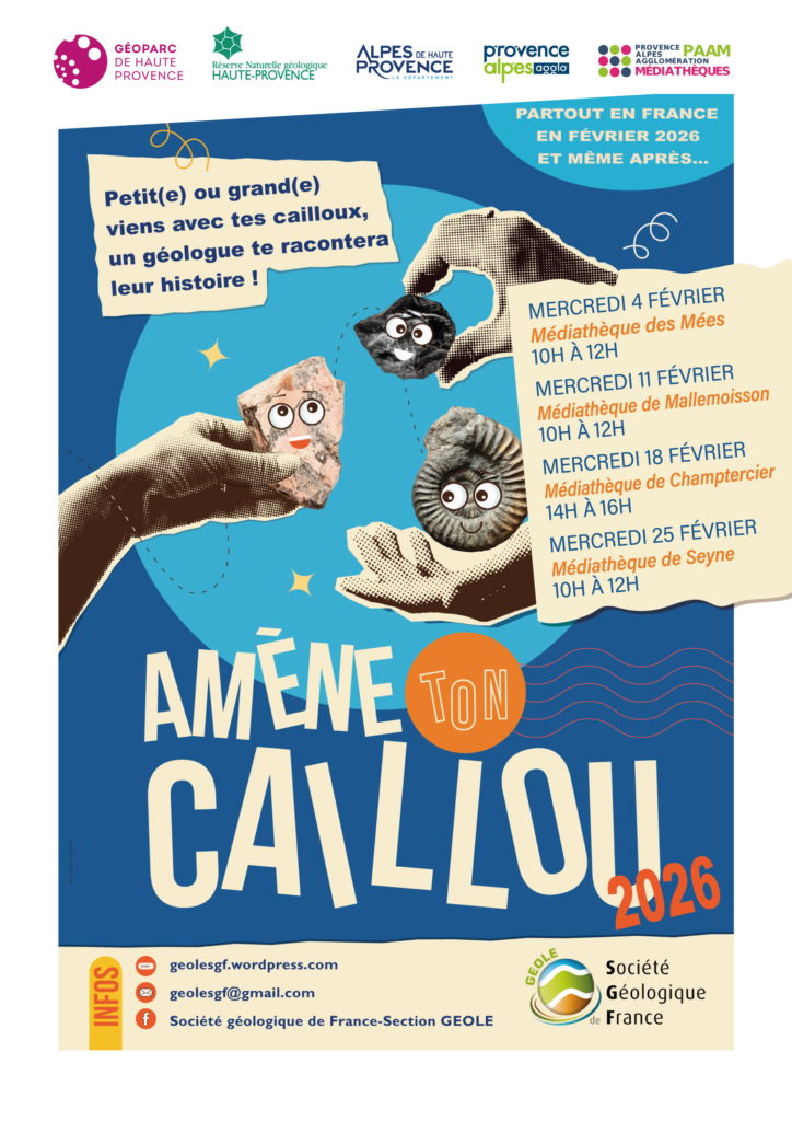 « Amène ton caillou » est un événement national organisé par la Société Géologique de France et la section Géole, et proposé localement par les géologues et médiateurs du Géoparc de Haute-Provence et de la Réserve Naturelle Géologique de Haute-Provence, en partenariat avec le réseau des médiathèques de Provence Alpes Agglomération.