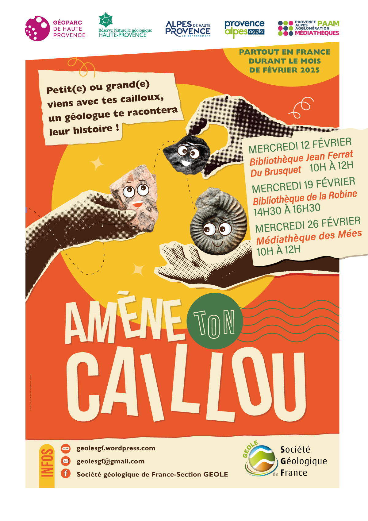 « Amène ton caillou » est un événement national organisé par la Société Géologique de France et la section Géole, et proposé localement par les géologues et médiateurs du Géoparc de Haute-Provence et de la Réserve Naturelle Nationale Géologique de Haute-Provence, en partenariat avec le réseau des médiathèques de Provence Alpes Agglomération.