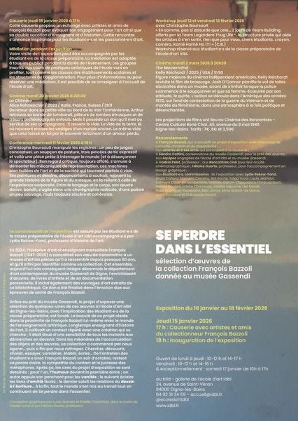 Grâce au prêt du musée Gassendi, le projet d’exposer une sélection de quelques-unes de ces œuvres à l’école d’art idbl de Digne-les-Bains, avec l’implication des étudiant·e·s de la classe préparatoire, est fondé. La beauté de ce projet réside dans la proximité de François Bazzoli lui-même avec le monde de l’enseignement artistique. Longtemps enseignant d’histoire de l’art, il cultivait un contact répété avec une création qui se cherche ; il était doué d’une sensibilité de tous les instants aux démarches en devenir. Dans les méandres de l’accumulation des objets et des œuvres, sa collection a commencé par nous égarer… puis a fini par nous rattraper. Chercher, découvrir, choisir, essayer, combiner, établir, écrire… De l’entretien des étudiant·e·s avec François Bazzoli un soir d’octobre, restent sa parole claire, la sympathie du contact et la justesse des métaphores. Après ça, les axes du projet d’exposition se sont dessinés ; pour l’un, l’humour devient la première arme ; un autre appuie son penchant pour les vanités ; le suivant éclaire les liens d’amitié tissés ; le dernier saisit les relations du dessin à l’écriture… à la fin, tout le monde s’est mis au travail tout en continuant de Se perdre dans l’essentiel.