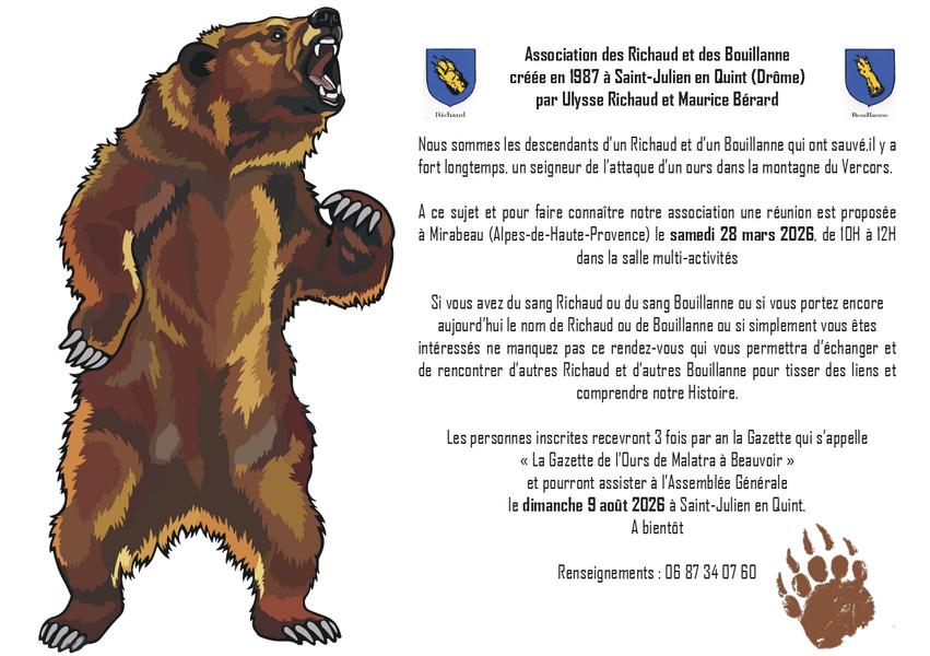 Nous sommes les descendants d’un Richaud et d’un Bouillanne qui ont sauvé, il y a fort longtemps, un seigneur de l’attaque d’un ours dans la montagne du Vercors.
