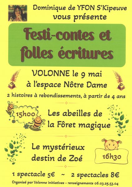 Dominique de YFON S’Kipeuve vous présente deux histoires à rebondissements, à 15h les abeilles et la forêt magique, à 16h30 le mystérieux destin de Zoé. A partir de 4 ans, 1 spectacle 5€, 2 spectacles 8€.