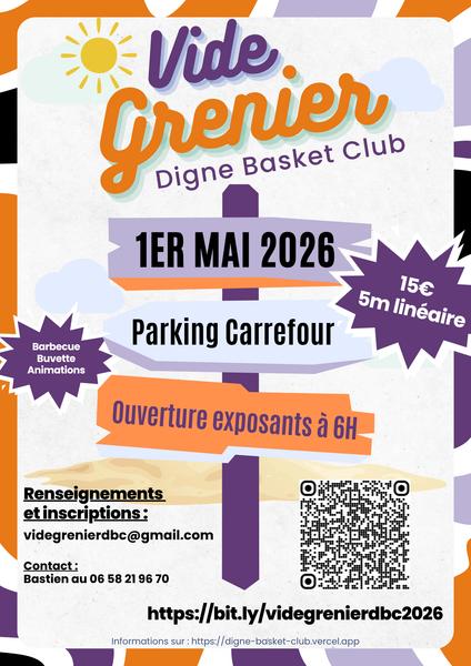 15€ les 5m linéaire. Inscription sur internet https://bit/ly/videgrenierdbc2026