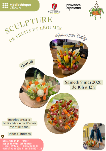 Atelier de sculpture de fruits et légumes animé par Cathy. Inscriptions à la bibliothèque de l’Escale avant le 7 mai. Places limitées.