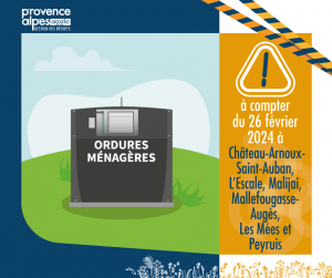 De nouvelles colonnes d’ordures ménagères et de tri sélectif ont en effet été installées sur 94 points de collecte déployés à Château-Arnoux-Saint-Auban, L’Escale, Ganagobie, Malijai, Mallefougasse-Augès, Les Mées, Peyruis et Volonne. Les habitants pourront y déposer leurs déchets à compter du lundi 26 février (à l’exception de Volonne et Ganagobie où les nouveaux équipements sont déjà en service). Les bacs roulants seront quant à eux progressivement retirés au mois de mars.