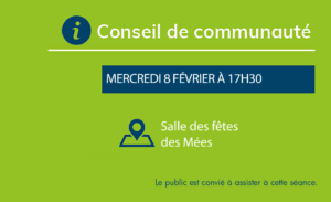 Conseil de communauté La prochaine séance du Conseil de communauté de l’agglomération se tiendra mercredi 8 février à 17h30 à la salle des fêtes des Mées. Le public est convié à assister à cette séance. Julia Vuillier2023-02-01T11:28:18+01:00 Partagez cet article ! FacebookXLinkedInPinterestEmail