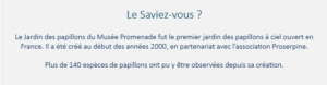 Au dernier niveau de la Maison des Remparts, l’espace auparavant dédié aux aquariums a été entièrement transformé pour faire place au monde des papillons. Cette nouvelle exposition reste ainsi dans la thématique du vivant, en faisant écho au Jardin des papillons dont elle complète la visite à travers des explications, maquettes, borne interactive et projections vidéos.