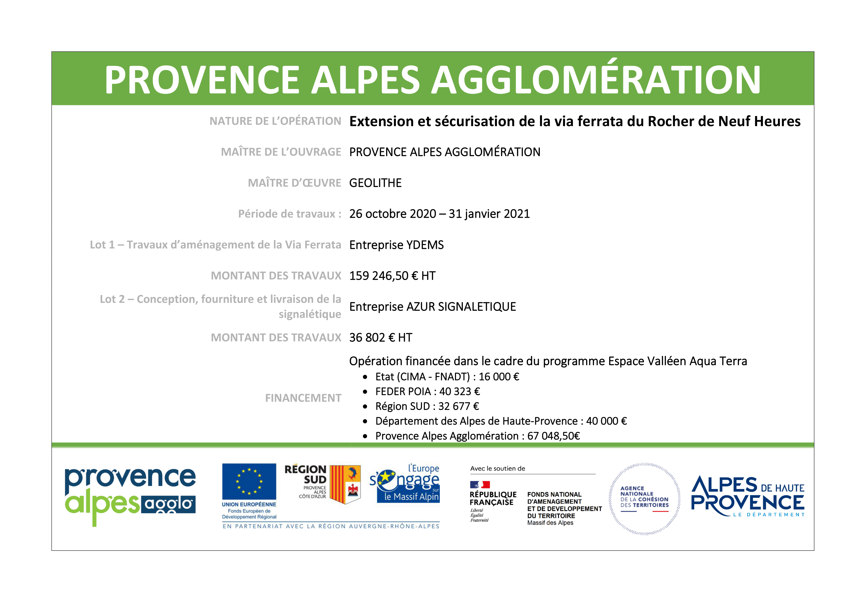 Ces aménagements sont financés par Provence Alpes Agglomération avec le soutien de l’Europe, l’Etat, la Région Sud Provence-Alpes-Côte d’Azur et le Département des Alpes de Haute-Provence dans le cadre de l’Espace Valléen Aqua Terra.