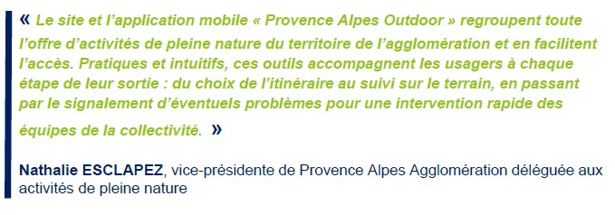 Le site et l’application mobile « Provence Alpes Outdoor » sont des services 100 % gratuits, développés et animés par Provence Alpes Agglomération, en collaboration avec l’office de tourisme Provence Alpes Digne-les-Bains.