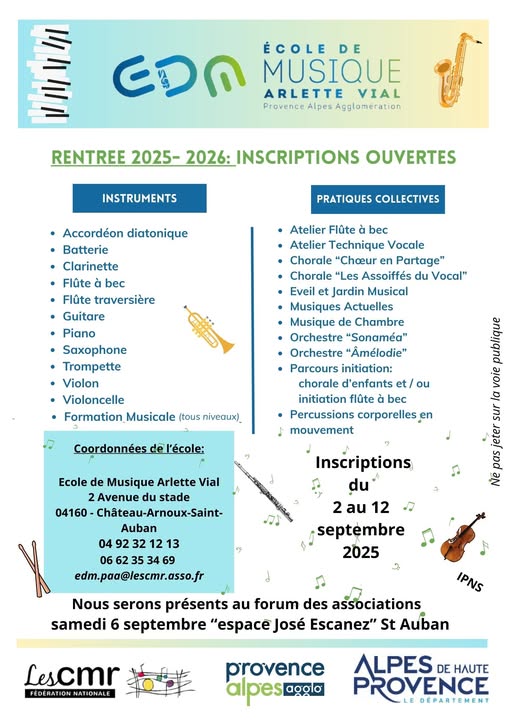 Piano, violon, saxophone, trompette, accordéon diatonique, flûte, batterie, clarinette, éveil musical… L’école de musique Arlette Vial à Saint-Auban propose de nombreux cours de tous niveaux !