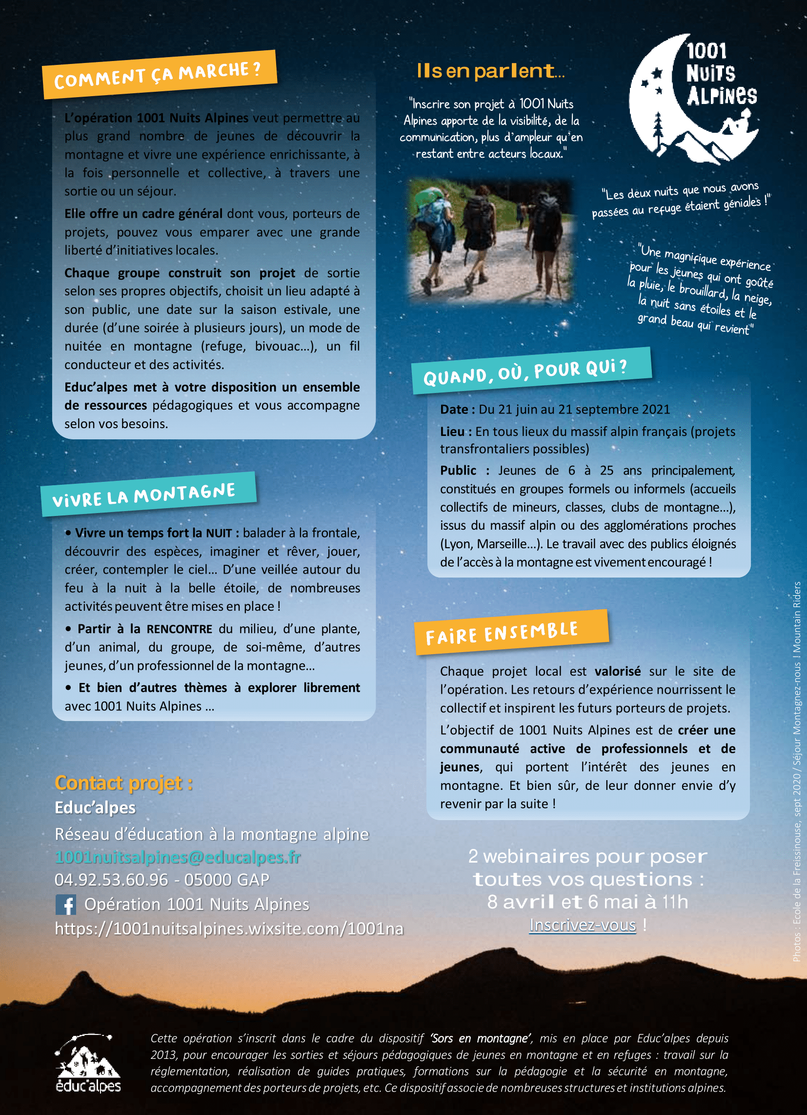 Pour tout renseignement sur l’opération 1001 Nuits Alpines, n’hésitez pas à contacter l’équipe salariée à 1001nuitsalpines@educalpes.fr