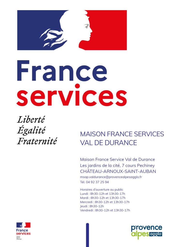 La Maison France Services du Val de Durance vous accueille le lundi, mardi, mercredi et vendredi de 8h30 à 12h et de 13h30 à 17h ; et le jeudi de 8h30 à 12h.