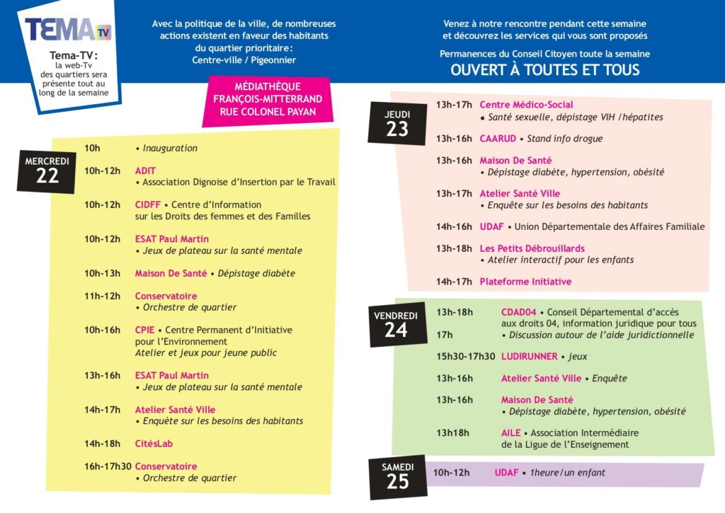 Cet évènement mobilise de nombreux partenaires investis auprès des quartiers prioritaires parmi lesquels l’ADIT (association dignoise d’insertion par le travail), le CIDFF (centre d’information sur les droits des femmes et des familles), l’Esat Paul Martin, le conservatoire, le CPIE (Centre Permanent d’initiative pour l’environnement), l’atelier Santé-Ville (ASV), Citéslab, le centre médico-social, le CAARUD (Centre d’accueil et d’accompagnement à la réduction des risques pour usagers de drogues), la Maison de santé, l’Udaf (Union départementale des affaires familiales), le CDAD04 (comité départemental d’accès aux droits), les associations Les Petits Débrouillards, Initiative, Ludirunner et Aile (association intermédiaire de la ligue de l’enseignement).