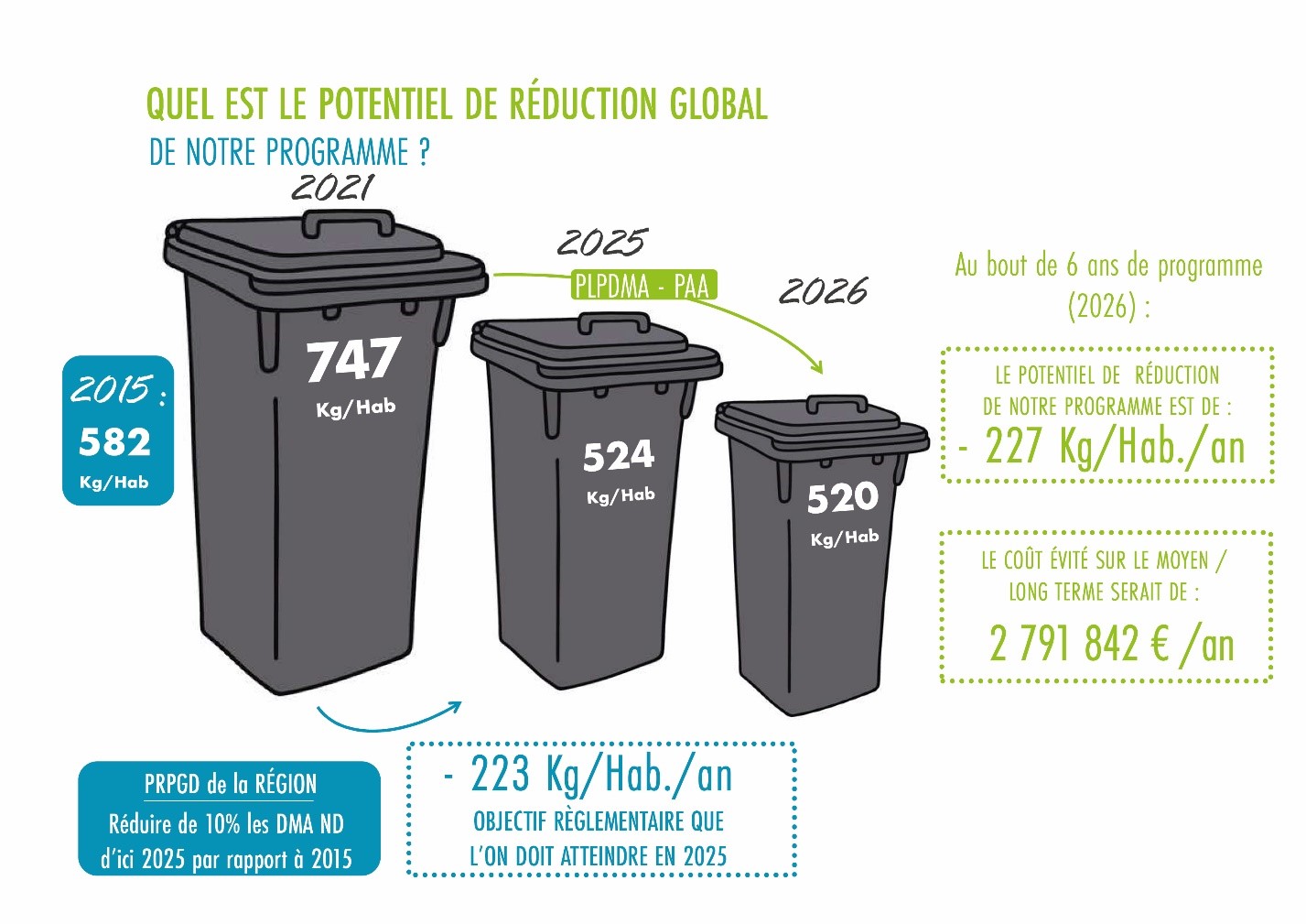 D’ici 2026, ce programme d’actions permettra d’atteindre un objectif global de réduction des déchets ménagers et assimilés (non dangereux) de -227 kg/an par habitant.