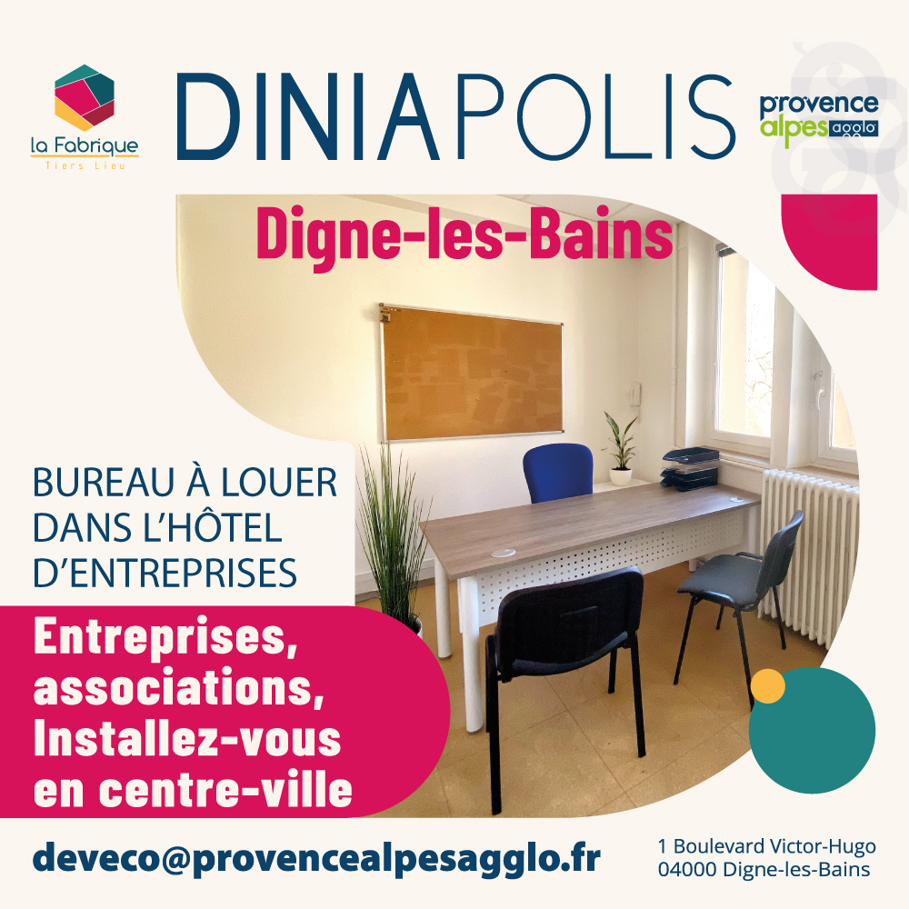 Que vous soyez en phase de création ou de développement de votre activité, l’hôtel d’entreprises de Provence Alpes Agglomération vous accueille au sein de Diniapolis, à Digne-les-Bains.